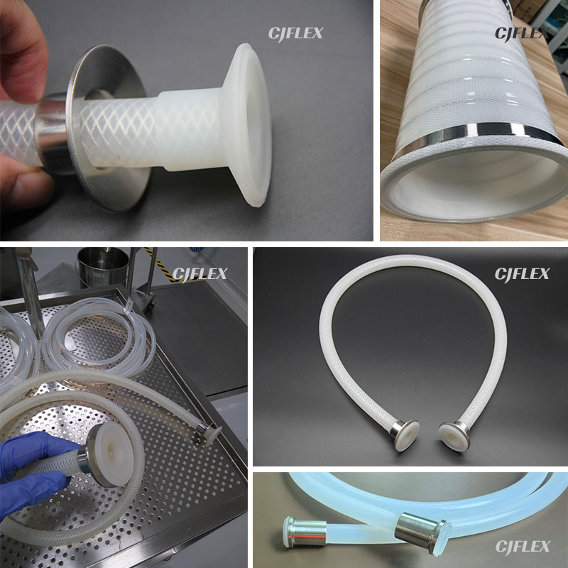 CJFLEX可提供医药级硅胶接头组件直接连接到硅胶管,使硅胶管总成接头实现“翻边”处理效果,这样不仅免去单独安装垫片的时间,更提高了整体洁净性。从软管内部到接头密封处全硅胶,避免接头扣压的滞留风险。该产品工艺非常适合生物制药等涉及无菌转移、无菌加工等高洁净要求的应用领域。